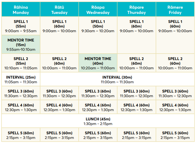 Our timetable provides dedicated time for explicit work on the key competencies of the New Zealand Curriculum, further than what is embedded within Learning Area work. All students will have two spells of mentor time per week.